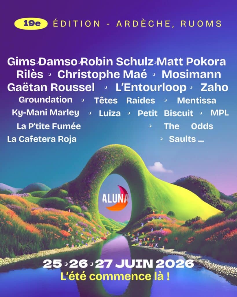 Le festival Aluna revient du 25 au 27 juin 2026 à Ruoms en Ardèche. Trois jours de musique avec Damso, Gims, Christophe Maé, Petit Biscuit et une vingtaine d’autres artistes. Ce festival de l’été 2026 en Rhône-Alpes s’annonce encore une fois comme un rendez-vous incontournable. On vous détaille tout le programme.