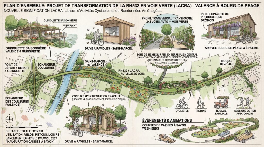 Vous l’avez remarqué ? Depuis le début de l’année, la LACRA est en travaux. Limitation à 70 km/h, voies réduites, bretelle fermée côté Grenoble : le quotidien des usagers entre Bourg-de-Péage et Valence est devenu un peu plus compliqué. Mais si ce chantier était le point de départ d’un projet autrement plus ambitieux : transformer la LACRA en voie verte ?