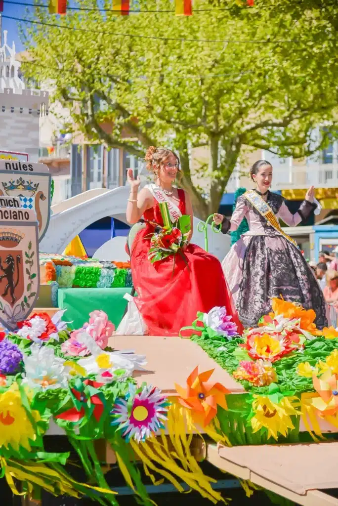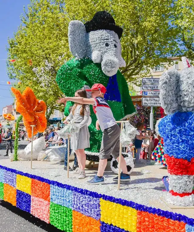 Le dimanche 5 et le lundi 6 avril, une douzaine de chars recouverts de milliers de fleurs en papier crépon défilent dans les rues du centre-ville à partir de 14h30. Toutes les fleurs sont façonnées à la main par des bénévoles, des associations et des écoles. Le dimanche soir, un feu d’artifice est tiré depuis le Pont Roman à 22h.