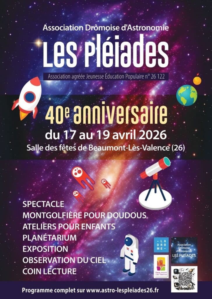 Pour leur 40ème anniversaire, l’association Les Pléiades vous propose une journée gratuite dédiée à l’astronomie le samedi 18 avril à la Salle des fêtes de Beaumont-lès-Valence, à partir de 10h.
