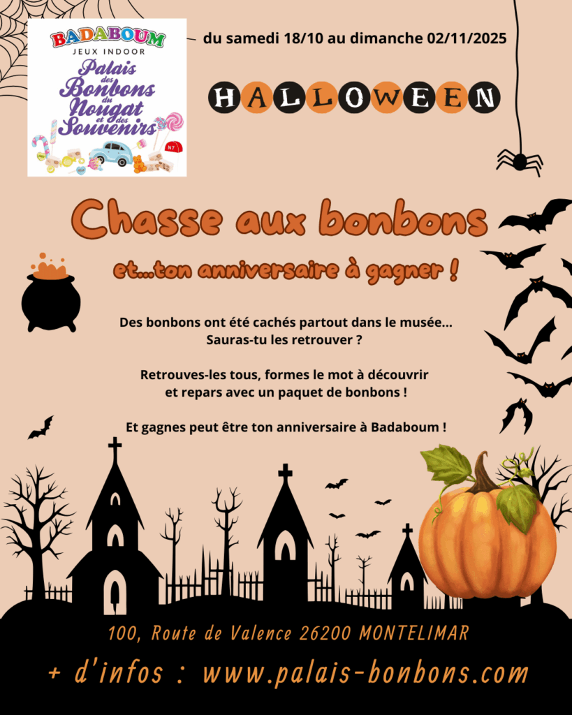 Direction Montélimar pour une chasse aux bonbons quotidienne spéciale Halloween. Parcourez les musées du Palais des Bonbons du Nougat et des Souvenirs joliment décorés pour l’occasion et recherchez tous les bonbons cachés dans les différentes salles. Une fois trouvés, décodez le mot mystère et présentez votre bulletin : vous repartirez avec un sachet de bonbons offert. Une activité ludique et gourmande pour toute la famille, accessible dès le plus jeune âge.