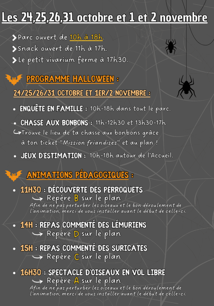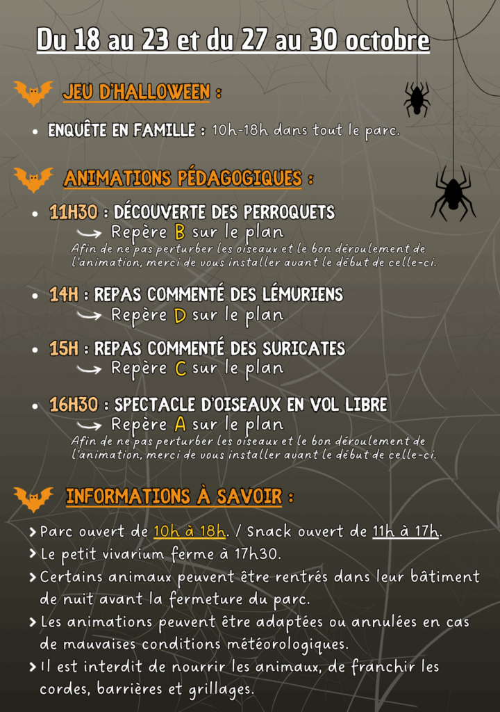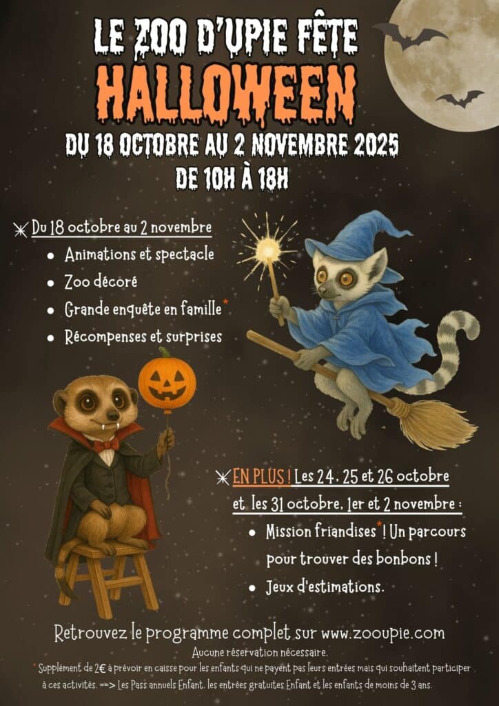 Pour finir cette sélection d’activités pour enfants pendant les vacances de la Toussaint 2025, le Zoo d’Upie vous invite à célébrer Halloween en famille dans la Drôme. Le parc sera entièrement décoré pour l’occasion et proposera une grande enquête familiale avec des récompenses et des surprises à gagner. Tout au long de la journée, profitez aussi d’animations pédagogiques : découverte des perroquets à 11h30, repas commenté des lémuriens à 14h, repas commenté des suricates à 15h et spectacle d’oiseaux en vol libre à 16h30.