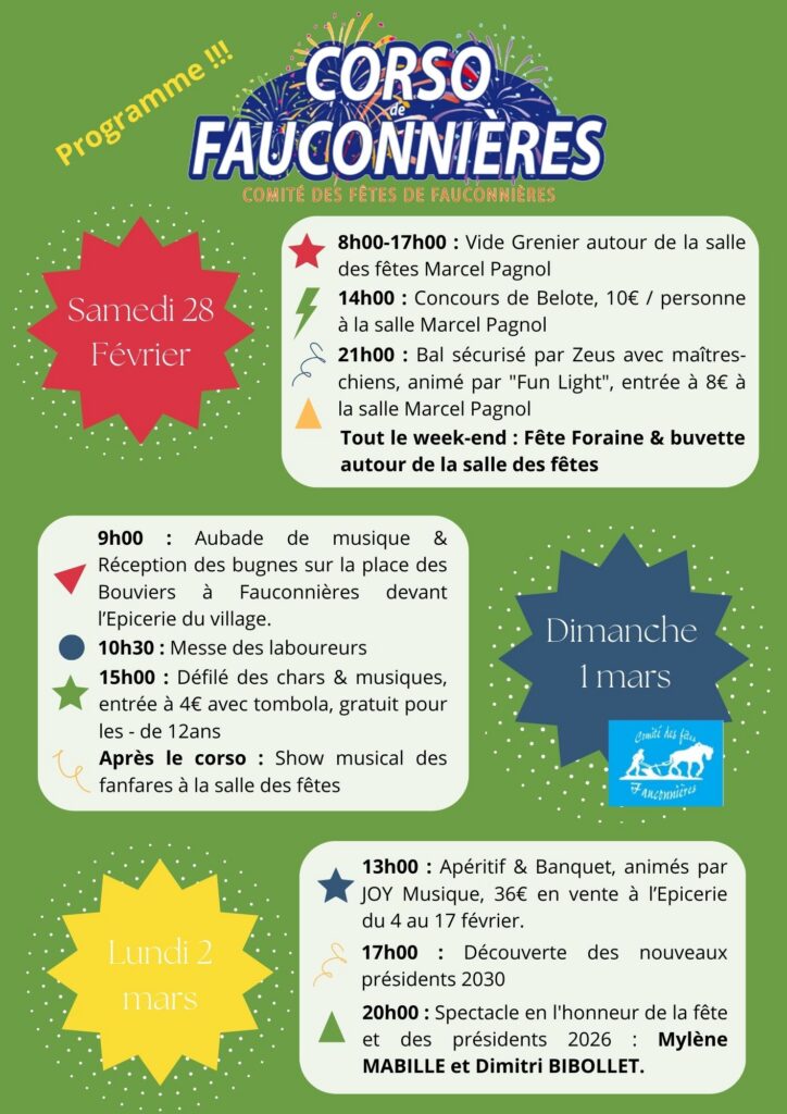 - Dimanche 1er mars : bugnes le matin, corso à 15h dans les rues de Fauconnières