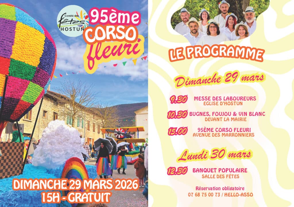 - Dimanche 29 mars : messe à 9h30 à l’église d’Hostun, bugnes, foujou et vin blanc à 10h30 devant la mairie, corso à 15h avenue des Marronniers