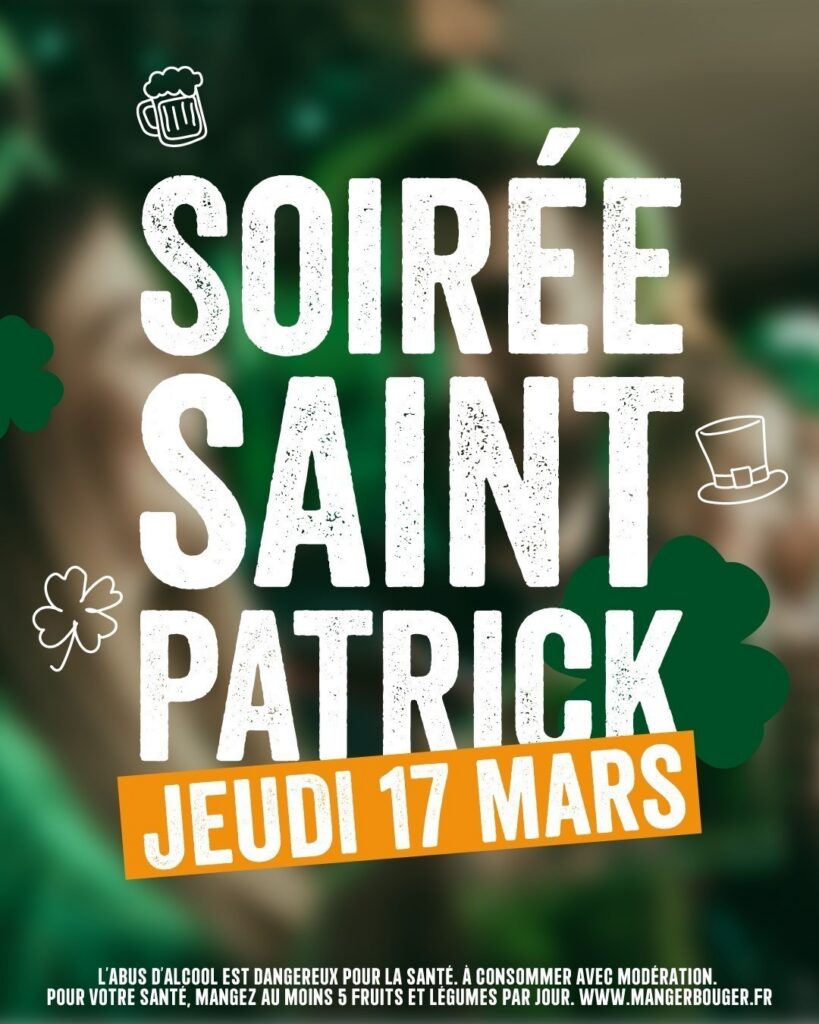 Au programme : un apéro quiz spécial Saint‑Patrick, une soirée DJ avec DJ Dorian Gamon, la diffusion du match France – Angleterre du Tournoi des Six Nations, et un concert du groupe The Chestnuts le 17 mars.