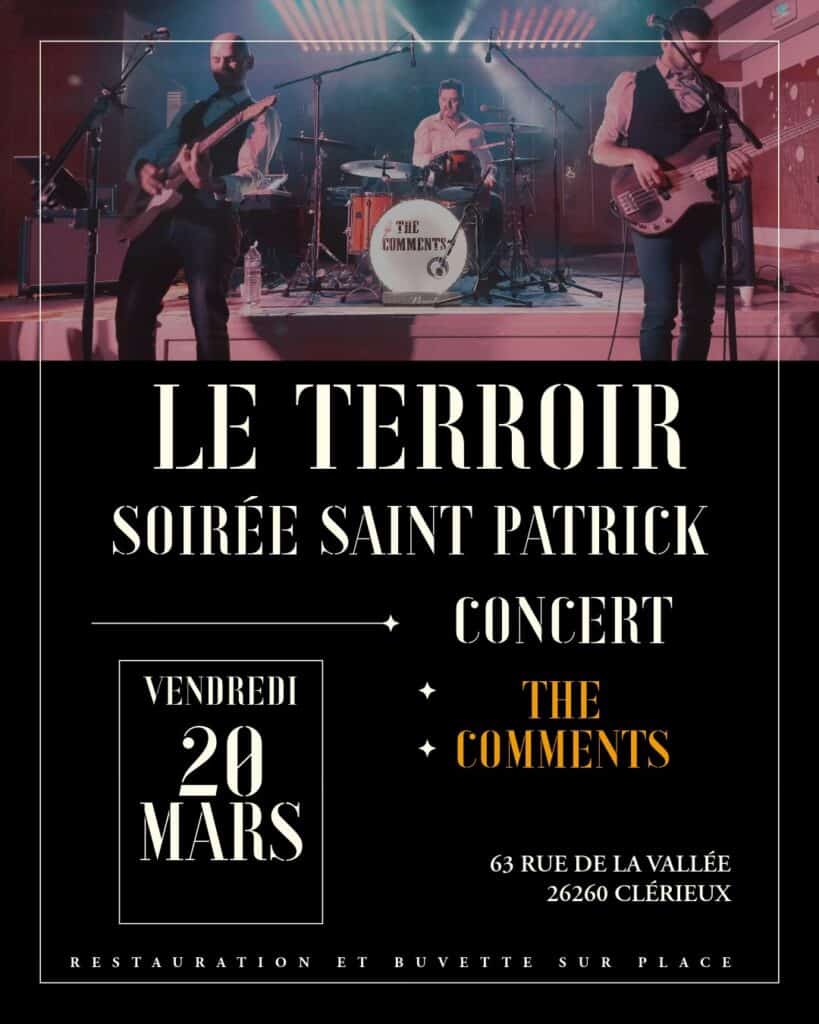 Le 20 mars, le restaurant Le Terroir à Clérieux célèbre la Saint‑Patrick Drôme 2026 avec un concert.