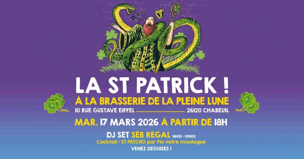 Le 17 mars, la Brasserie de la Pleine Lune à Chabeuil organise une soirée pour célébrer la Saint‑Patrick dans la Drôme 2026.