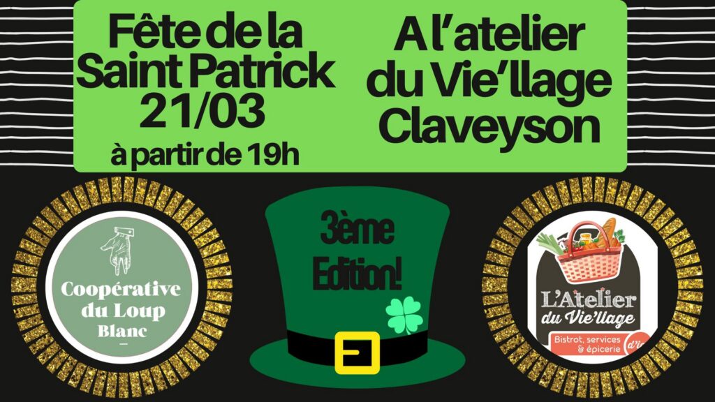 Le samedi 21 mars 2026, l’Atelier du Vie’llage à Claveyson vous donne rendez‑vous à partir de 19h pour une soirée spéciale Saint‑Patrick Drôme 2026.