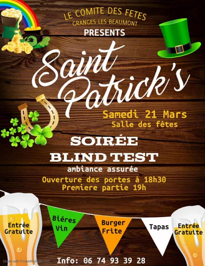 Le Comité des fêtes de Granges‑les‑Beaumont organise lui aussi une soirée pour la Saint‑Patrick dans la Drôme 2026.