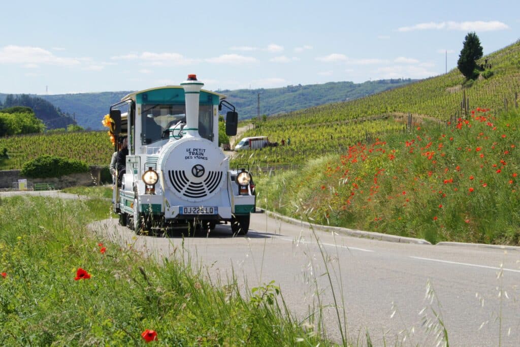 Le petit train vous fait d’abord visiter la ville de Tain-l’Hermitage, puis monte dans les coteaux de l’Hermitage au milieu des vignes. Vous découvrez les terrasses en pierres sèches qui abritent les cépages Syrah, Marsanne et Roussanne de l’AOC Hermitage.